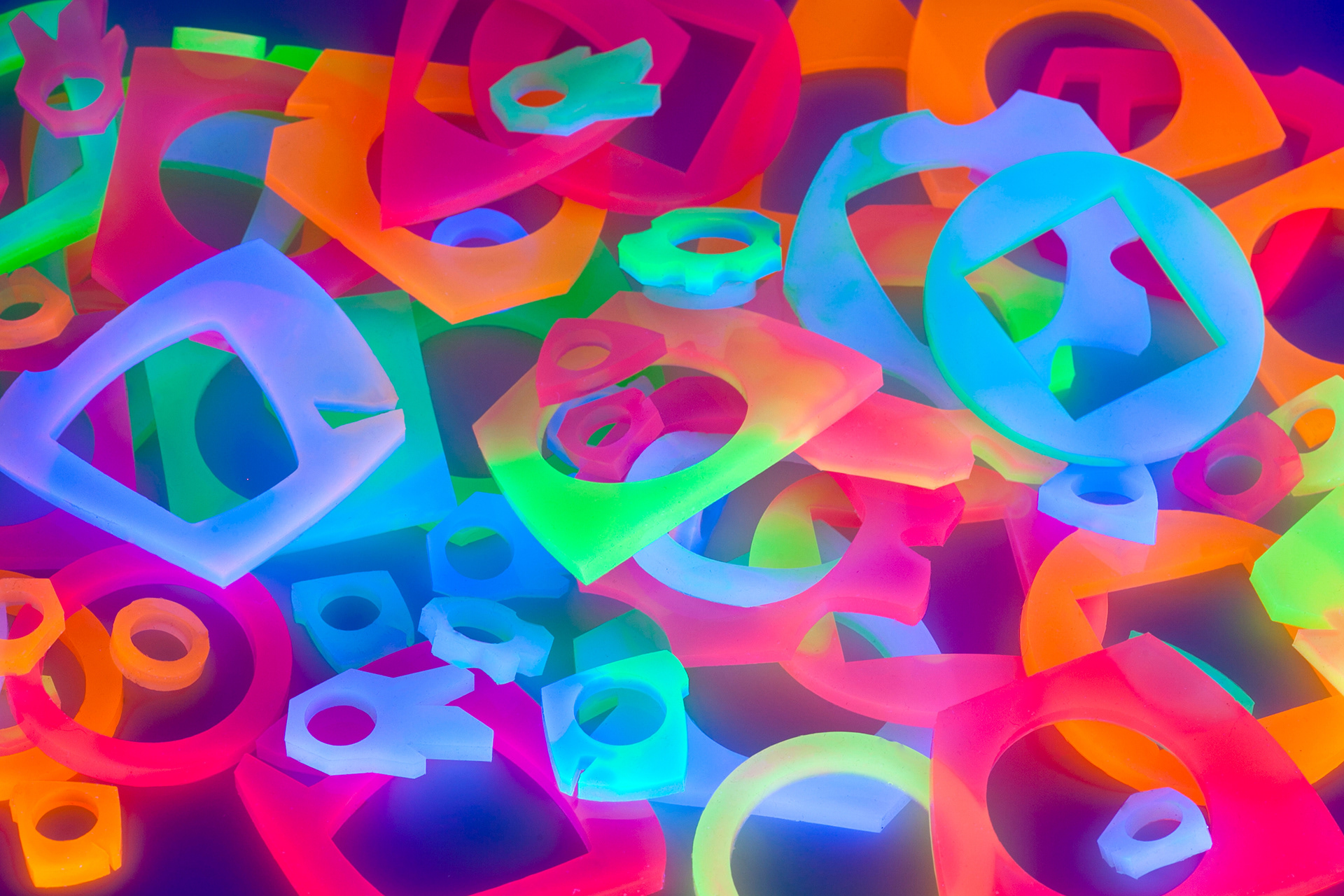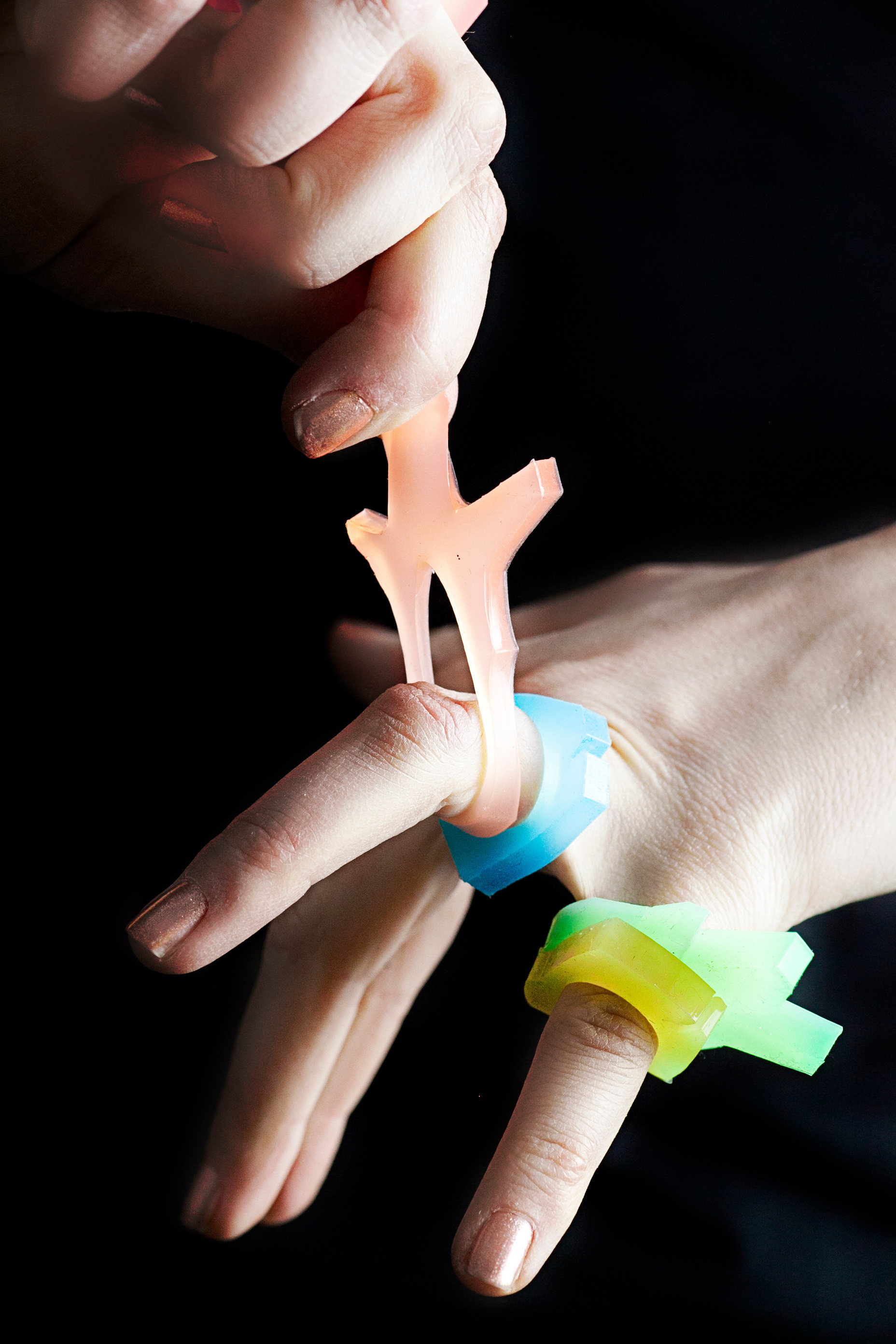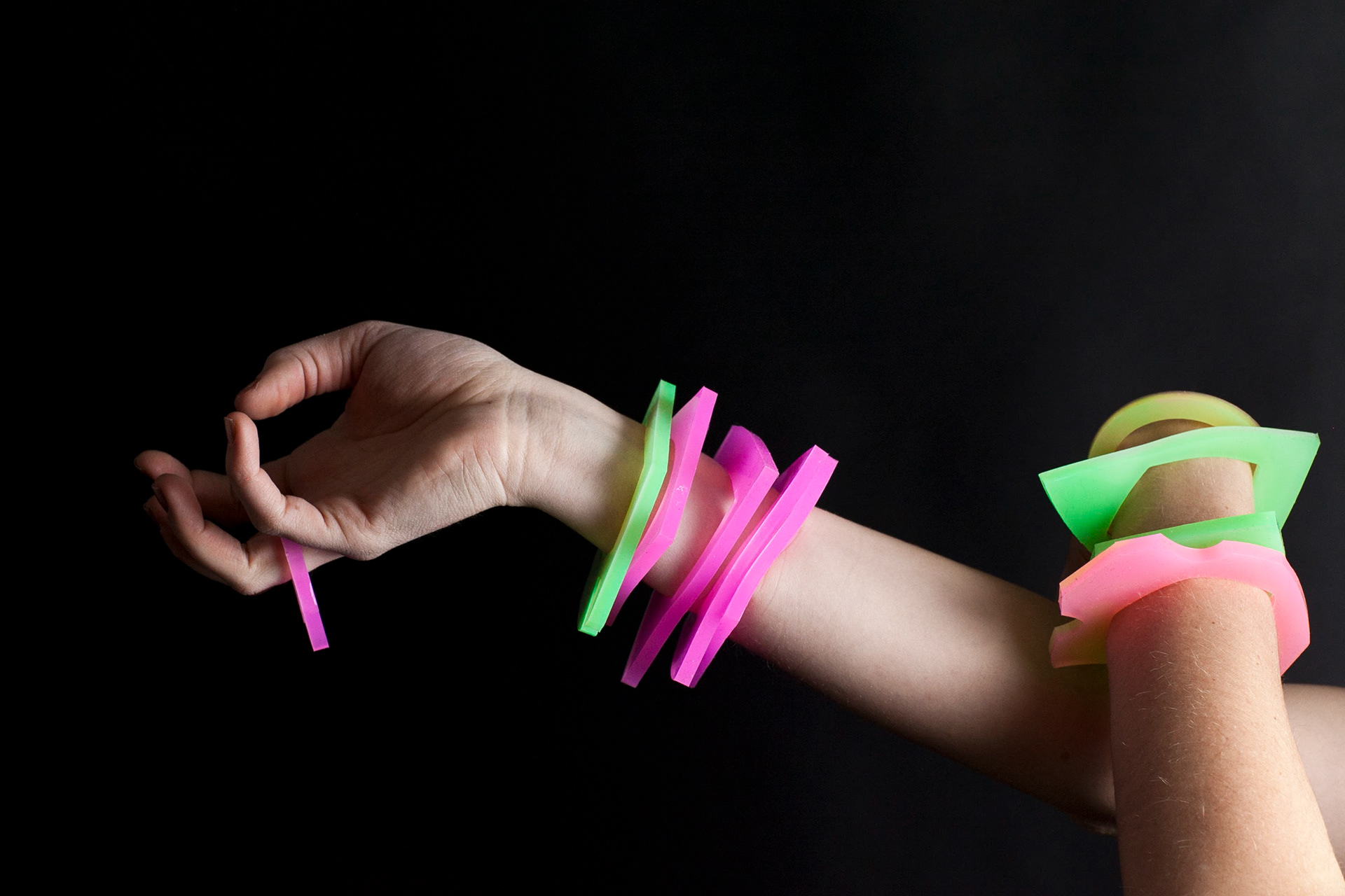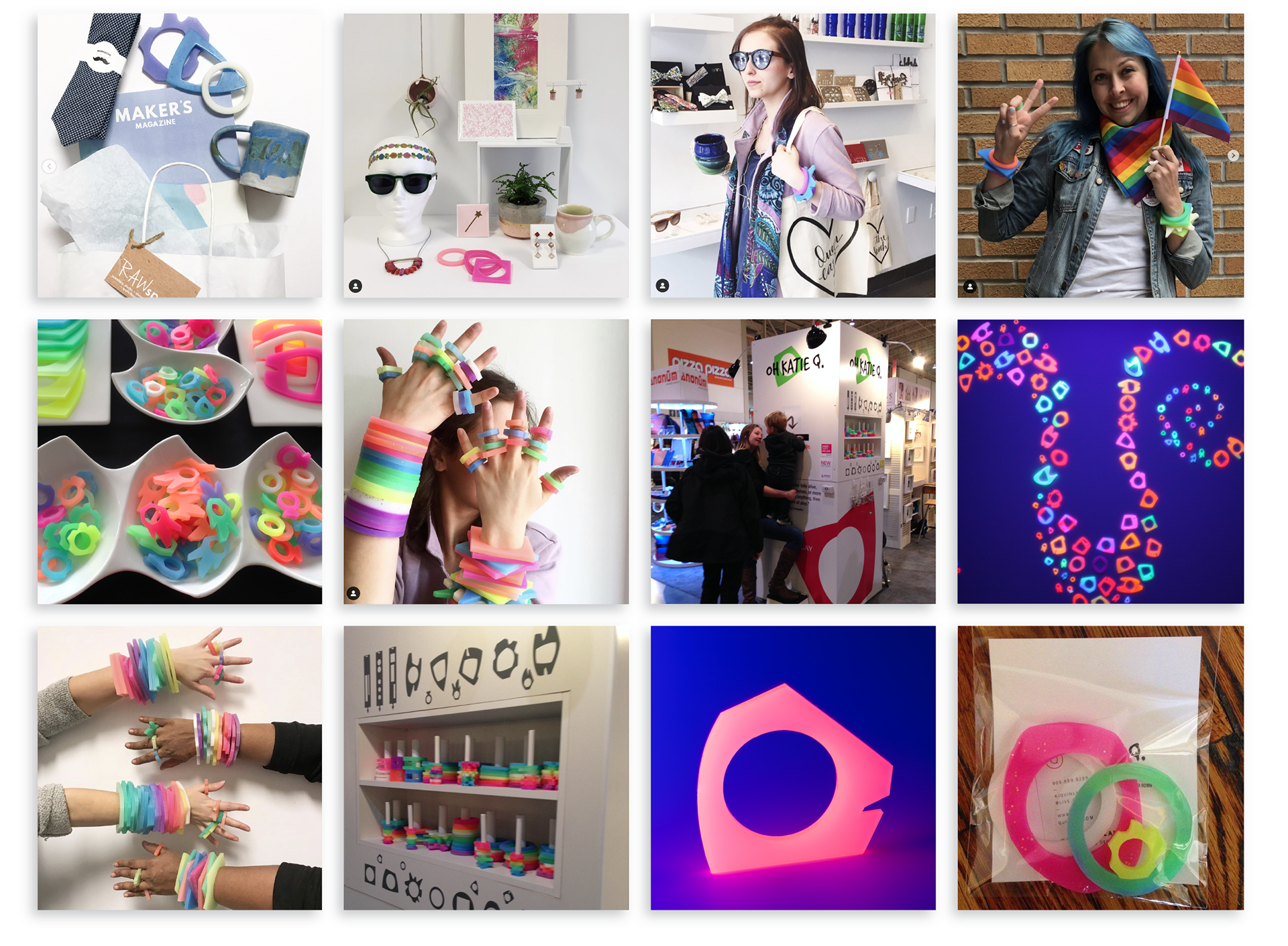 Oh Katie Q. Jewellery is an artisan jewellery company based in Toronto, Canada that focuses on promoting active participation, creative expression, and conscious integration of play into our daily lives through one of a kind silicone jewellery. This unique handmade organic and geometric shaped jewellery is made from a specialty silicone, which has the ability to stretch, twist, and withstand aggressive pull; like a rubber band, silicone also has the useful property of returning to its original shape when released from tension. Its texture is smooth, yet squishy and each piece has been uniquely dyed with ultraviolet pigments (black light dye) and glow in the dark dyes to create a whole new multi-sensory experience. Through the elements of elasticity, texture, and color, these pieces steal the spotlight.
